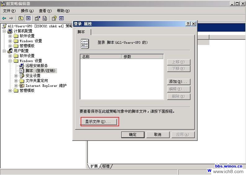 4、在左框选择“脚本”在右框“登录属性“,弹出对话框后点击”显示文件