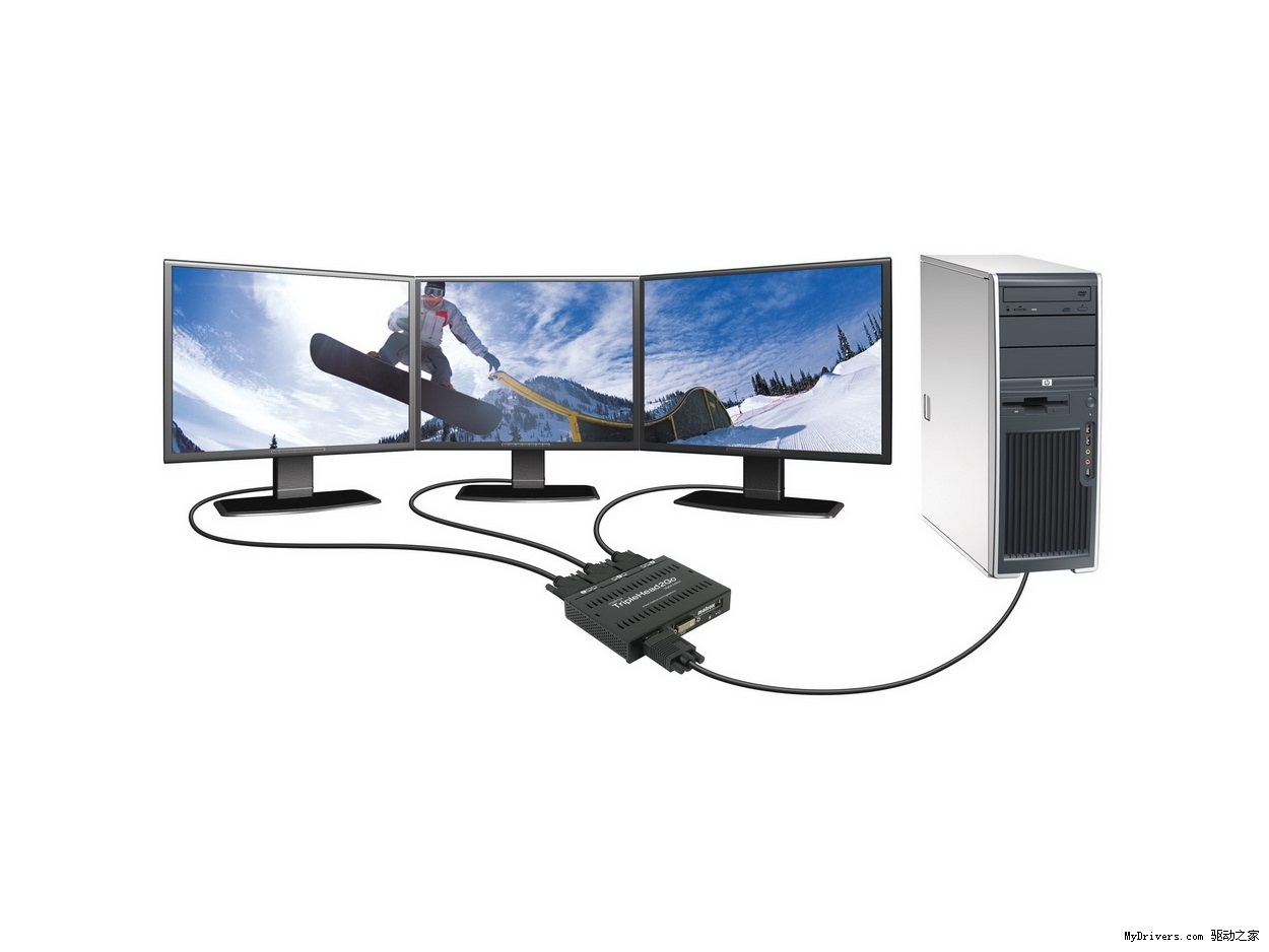 如果你使用的是Intel HD Graphics整合处理器或者4系列整合芯片组,无论是桌面版还是移动版,搭配DualHead2Go所能支持的最高分辨率将从2×1280×1024升至2×1920×1080,达到全高清级别,搭配TripleHead2Go则能从3×800×600升至3×1280×1024(普屏)或者3×1360×768(宽屏)。