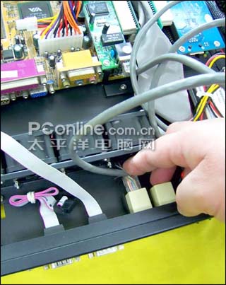 一切顺利,最后要把藏在机箱内的两个网卡的接口引出来到前面板上,自己动手做了两条网线,把网线一头插入网卡。