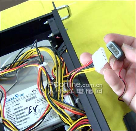 把电子盘的供电接头和电源上的大4pin接头插在一起。
