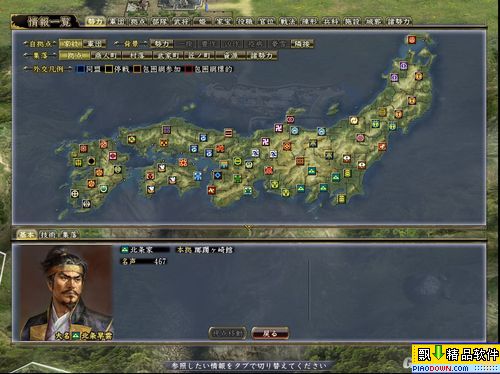 兵力图上可以看出南部晴政3城7W+兵为兵力最强,其次便是我鸟取王国~但其地理得天独厚,若平定东部地区,将来与我王一争天下,也未可知!