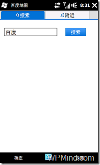 百度的特点在于其增加了一个“附近搜索”的功能。可惜其败笔在于界面上“搜索”按钮和下方“确定”菜单的重复设置。