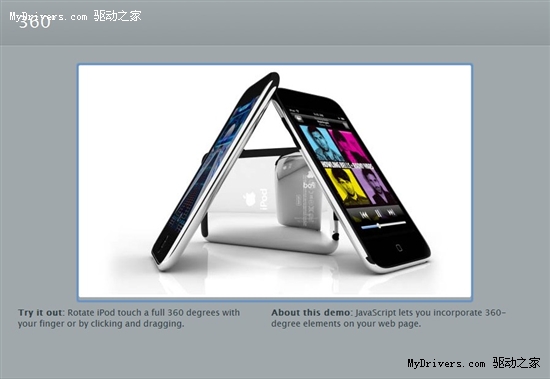 或许可以算是与Adobe之间“开放”平台之争的新回合,苹果今天在官方网站上专门开辟了一个栏目,展示基于HTML5标准的网页动态应用效果。苹果展示的动态网页效果综合应用了HTML5、CSS以及JavaScript技术,包括7款Demo,分别是网页视频、文字特效、画面变换、图片 浏览、音频、360度全景图片以及VR虚拟现实。所有Demo都可以在iPhone、iPod touch、iPad或Mac/Windows版的Safari浏览器上运行,其他浏览器打开该网页会被要求下载Safari。