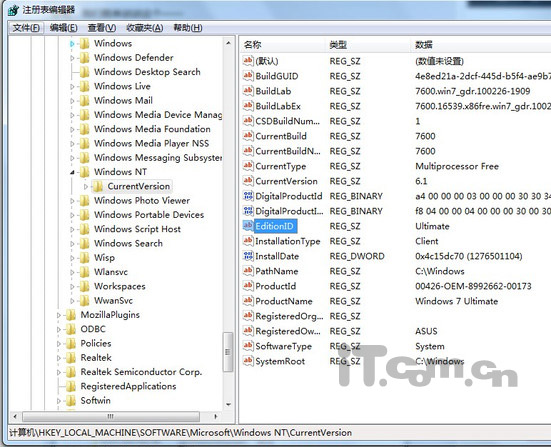 然后,在右侧修改“EditionID”的值为“HomePremium”,再修改“ProductName”的值为“Windows 7 HomePremium”,让安装程序以为当前系统是一个更低的版本(注意,这里修改的注册表数值名称必须和你安装盘上的系统名称一致),然后用原来的安装光盘重新安装即可(需要重新激活)。