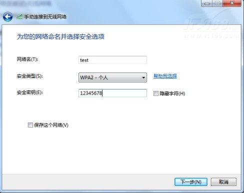 输入“网络名”、“密码”,并点击“下一步”。如果您经常需要这样的一个网络的话,您也可以选择勾选“保存这个网络”选项。