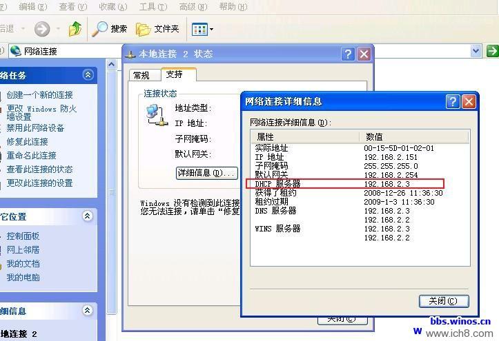 2、打开“开始”菜单,“设置”“网络连接”双击“本地连接”“支持”“详细信息”如下图是从WinOSDC2获得的IP地址。