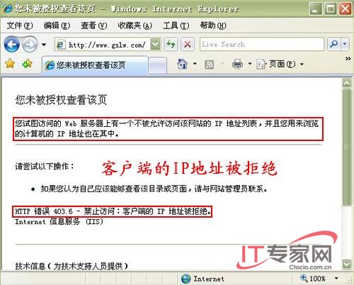 当IIS部署完成Web成功发布后却被告知某些用户无法访问Web页面,当他们访问Web站点的时候,浏览器显示错误页,错误提示为“HTTP错误403.6-禁止访问:客户端的IP地址被拒绝”。