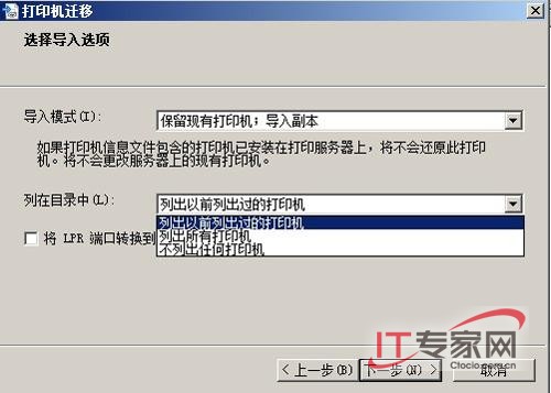 需要注意的是,在“选择导入选项”页面中,有两个选项分别是:“保留现有打印机:导入副本”,如果选择该项,则现有打印队列和要导入的队列名称相同,向导将会创建副本,以确保原来的打印队列和导入的队列都可用。“覆盖现有打印机”,如果选择该项,现有打印队列和要导入的队列名称相同,向导会使用导入的队列覆盖现有的队列。对于这两个选项,大家可以根据需要进行选择,一般情况下我们选择“覆盖现有打印机”。此外,在“选择导入选项”页面的“列在目录中”下拉列表中有三选项,需要说明一下:“列出以前列出过的打印机”,如果选择该项可以确保只有以前列出过的打印机可以被列在Active Directory中。“列出所有打印机”,选择该项可以确保所有打印机都被列在Active Directory中。“不列出打印机”,选择该选项可以确保Active Directory中不列出该打印机。当然,如果导入错误我们可以单击“打开事件查看器”根据事件记录进行排错。(图6)