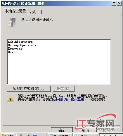 其次在目标分支下面双击“从网络访问此计算机”选项,当系统屏幕上出现如图2所示的设置对话框时,我们仔细检查一下“本地安全设置”设置页面中,是否存在自己使用的共享访问账号;例如,当我们默认以“Guest”账号进行共享访问操作时,如果“Guest”账号没有出现在图2所示的设置对话框中时,那系统就会出现禁止访问的提示,此时我们只要单击“添加”按钮,将自己使用的共享访问账号添加进来就可以了。
