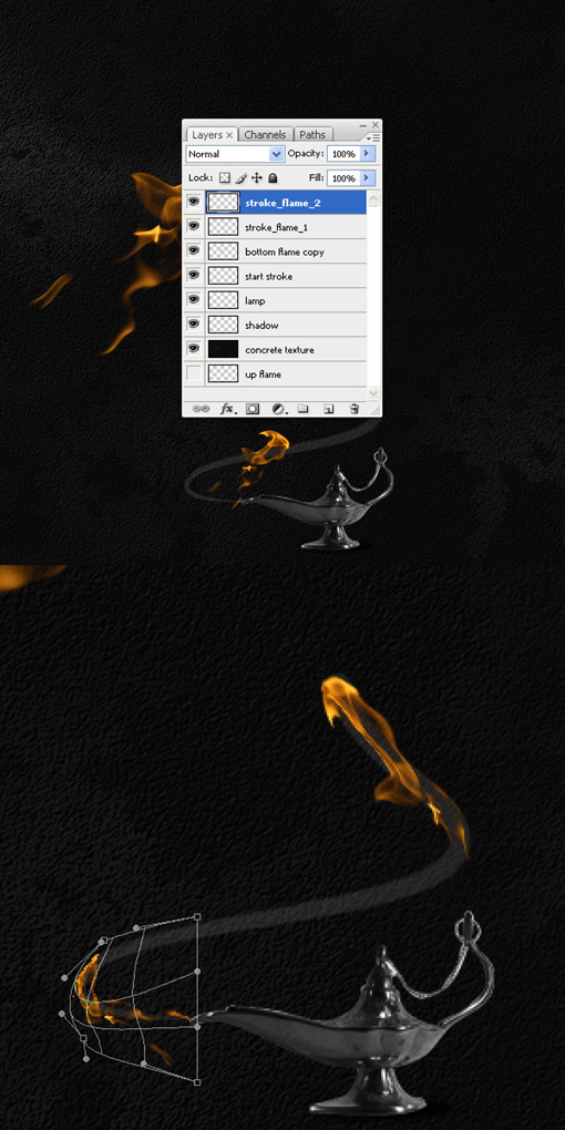 步骤二十一:现在,我们让刚才隐藏的上面的那个火焰显示,命名这个图层为“stroke_flame_4”,把它放到所有图层的最上面,像前面那样稍微缩小一下然后进行适当变形,如下图所示。
