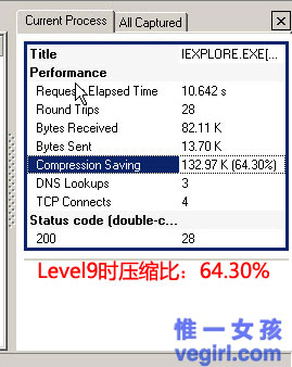 可以看到,上图中的 Compression Saving显示为0,我们启用Gzip压缩,再来看一下HTTP头信息情况: